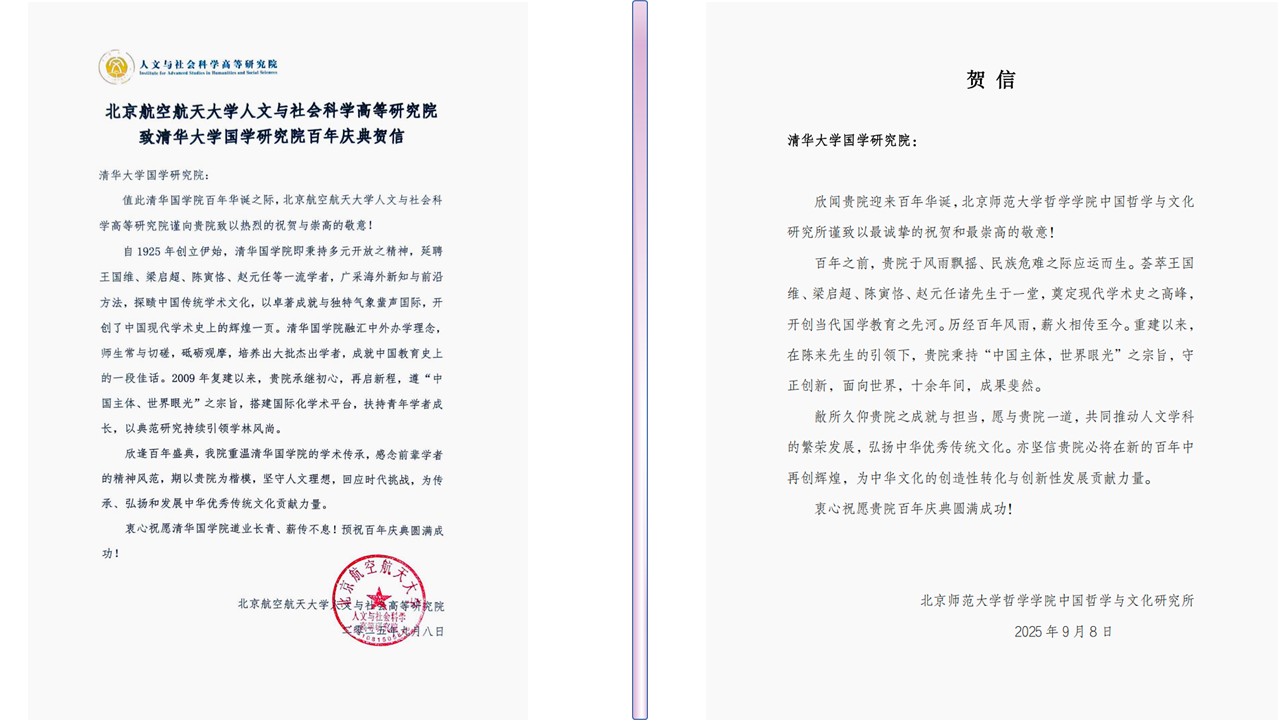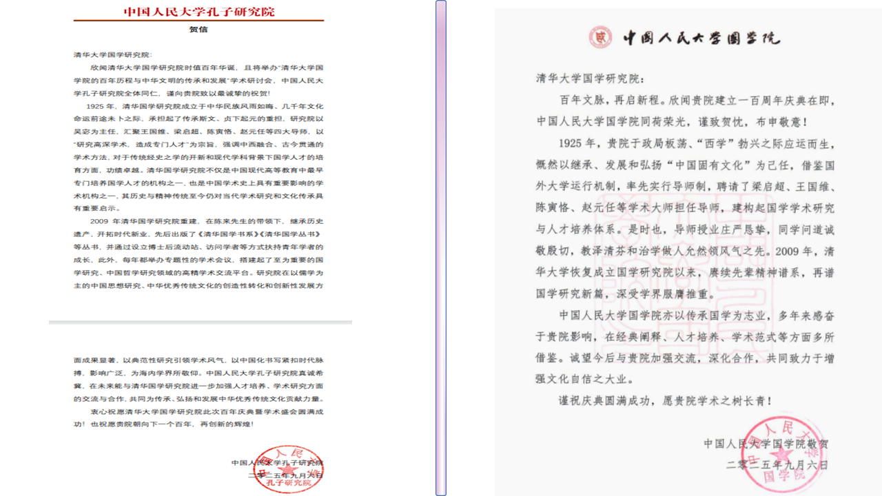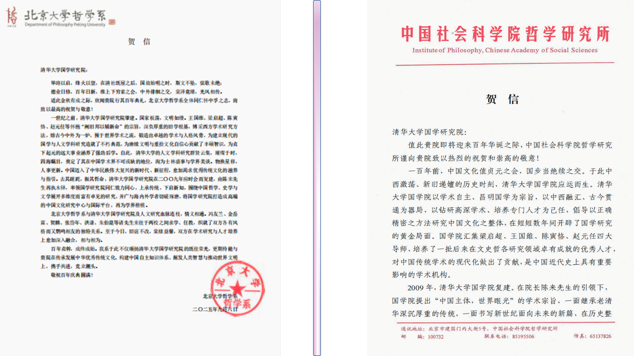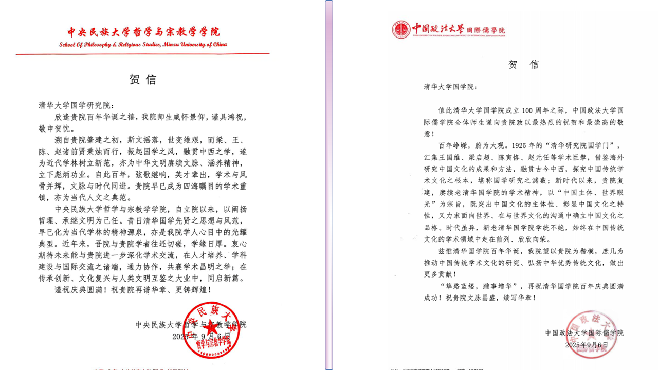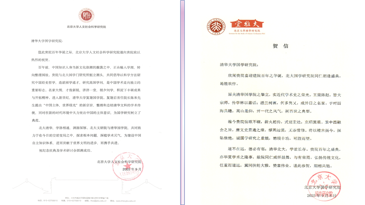 值清华大学国学研究院成立100周年之际,国内多所高校的相关院系及科研机构纷纷发来贺信,对国学院在学术研究与人才培养等领域取得的成就致以高度赞誉,对国学院未来发展寄予殷切期望。现将贺信整理发布,感谢各单位对国学院的美好祝愿!未来国学院愿同各单位一起携手,推动中华文明的发展,实现中华文化的伟大复兴!